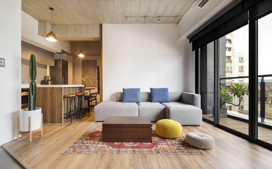 3房2廳室內約33坪,我們微調格局讓客廳更大,讓原有的大面積落地窗開闊性更佳,前陽台鋪上南方松地板,除了讓室內地板延伸感直到戶外,更大大增加陽台的使用機率。